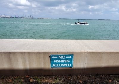 Llamé al número que se muestra y descubrí que, aunque no es una cosa que ocurre a menudo, tuvieron que colocar el letrero desde que se vio un cocodrilo en julio de 2019. Tú podrás decir, “¡pero eso es agua salada! ¡Es el océano!” – Y tienes toda la razón, pero en el lado norte de esta pequeña isla se encuentra la desembocadura del río Miami y docenas de canales de agua se conectan al río a lo largo de su recorrido.