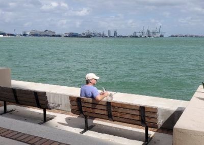 Justo al frente, verás Bayside con su nueva e icónica Rueda de la Fortuna (o Rueda Gigante) y el Hard Rock Café. Más a tu derecha, frente a Bayside, verá el Puerto de Miami, conocido popularmente como la “Capital Mundial Cruceros”. En un día domingo, que fue cuando tomé estas fotos, el puerto suele estar lleno de mega barcos de diferentes líneas de cruceros listos para navegar hacia el Caribe.